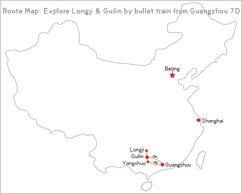 Today you will take 2-hour bullet train from Guangzhou to Guilin this morning. Upon arrival, you will be transferred to Longji Rice Terraces where you will hike around the mountain villages.