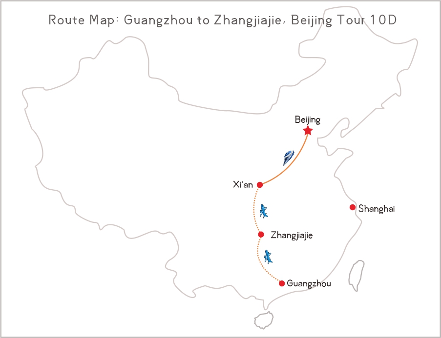 This 10-day private tour will let you explore Guangzhou, Zhangjiajie and Beijing in 10 days with your local guide. The package tour will make your tour easy and happy. The tour start from Guangzhou and end in Beiijng, both cities are connected with many cities in the world, and you can travel easily from Hong Kong to Guangzhou as well.