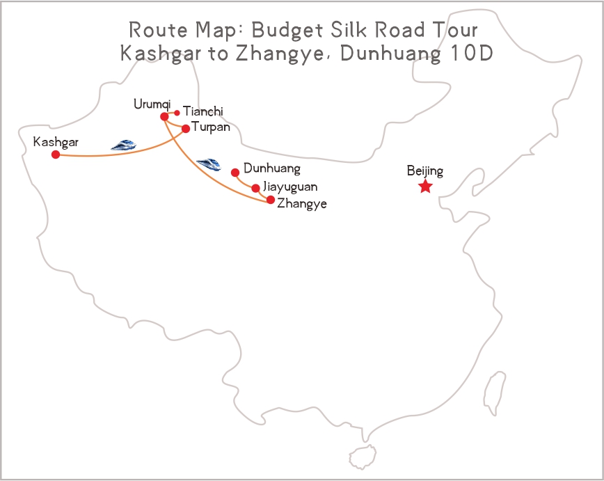 Embark on a 10-day journey along China's legendary Silk Road, traveling from Kashgar to Zhangye, Jiayuguan and Dunhuang on a budget. Using a mix of local transport—including cars, buses, taxis, and hard sleeper trains—you'll experience the route as travelers have for centuries. Visit historic cities like Kashgar, Turpan, Urumqi, Zhangye, Jiayuguan, and Dunhuang, and immerse yourself in the rich history and vibrant cultures that shaped this ancient trade route.