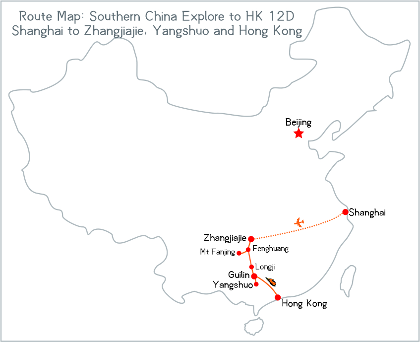 Zhangjiajie and Mt Fanjing are renowned mountains in the Southern China. This 12-day tour will offer you opportunity to explore Shanghai, Zhangjiajie, Mt Fanjing, Fenghuang Old Town, Longji Rice Terraces, Yangshuo and Hong Kong. You will view the landscape, meet the nice people, and taste the yummy food with your local guide.