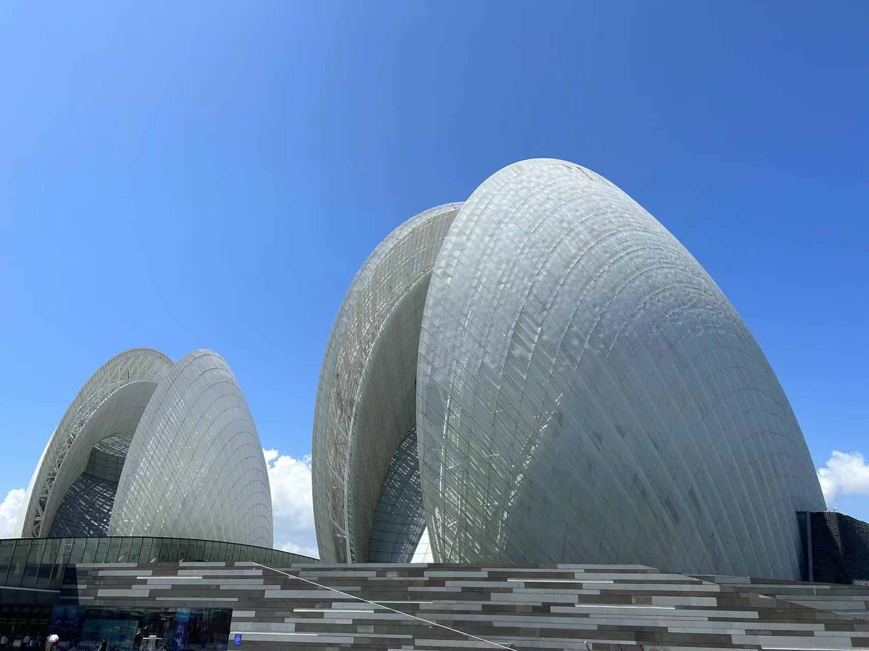 View the Zhuhai Grand Theater, affectionately known as The Crescent Moon, which is the iconic landmark of Zhuhai and a masterpiece of modern architectural design. Situated uniquely on the secluded island of Yeli Island, it is surrounded by the waters of the South China Sea, creating a stunning visual both day and night.