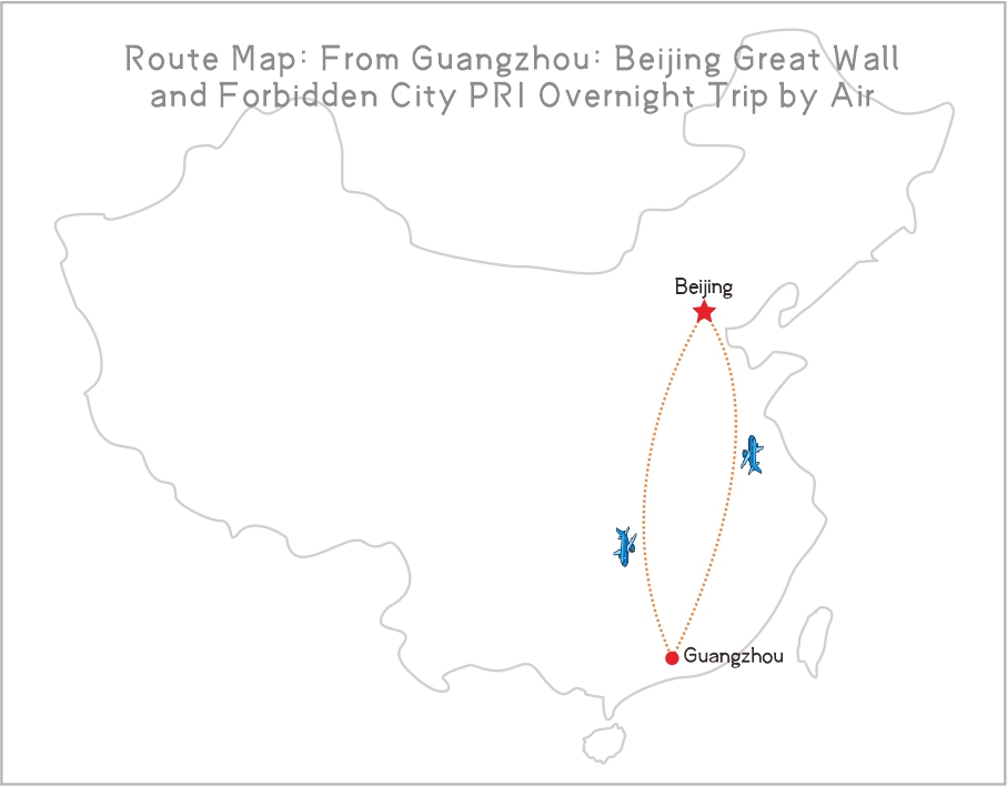 Later you will be transferred to Beijing airport to catch your flight back to Guangzhou. Upon arrival, you will be transferred back to your Guangzhou hotel where this day trip concludes. Flight information will be sent to you before your travel date.