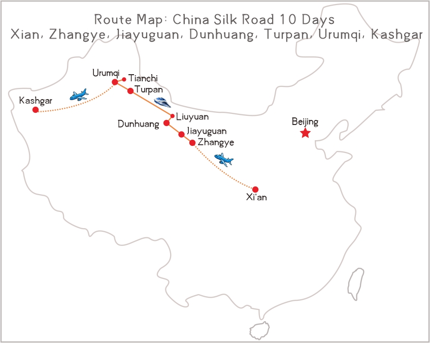 This 10-day China Silk Road will let you travel along the ancient Silk Road to Xi'an, Zhangye, Jiayuguan, Dunhuang, Turpan, Urumqi and Kashgar, exploring the fantastic sites with local guide. You will learn the ancient history on the route, and view the impressive landscape during the tour.