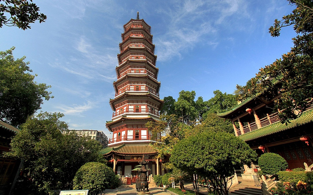 Liu Rong, means "Six Banyan". The temple is a 1400-year-old monastery,dating from 537AD. It is a famous buddist cultural site. In Liang Dynasty,a Buddhism priest planned to go to Cambodia to bring the Buddhist relic back to Guangzhou. So the Emperor required to build the temple for storing the relic. The temple destroyed by fire and rebuilt for several times. But it got the name "Liu Rong" in 1100AD, Northern Song Dynasty, from a celebrated writer Su Dongpo.The major structure in the temple is Liu Rong Pagoda, and because of its beautiful look, it is also called "flower pagoda". It is 57m high, with 9 storeys outside, 17 storeys inside.