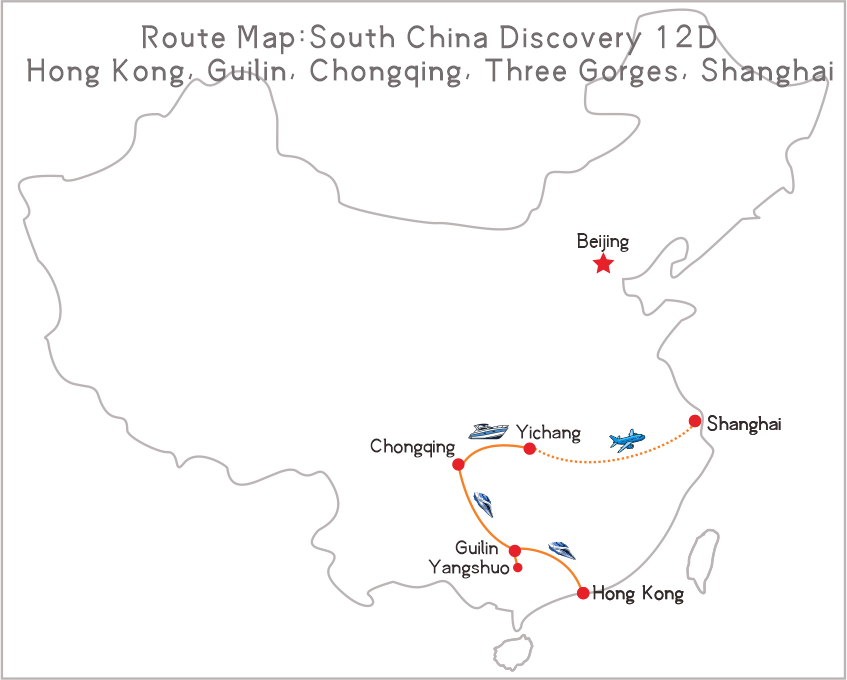 The tour will let you explore the southern China including Hong Kong, Yangshuo, Guilin, Three Gorges, and Shanghai. It is great to view the landscape and learn the history about China in 12 days. Note: There are three included shore excursions on the cruise, we will send you the specific included items before the tour as each cruise has different included shore excursions. The cruise itinerary is subject to change due to river regulation and weather, please refer the updated itinerary while boarding the cruise.