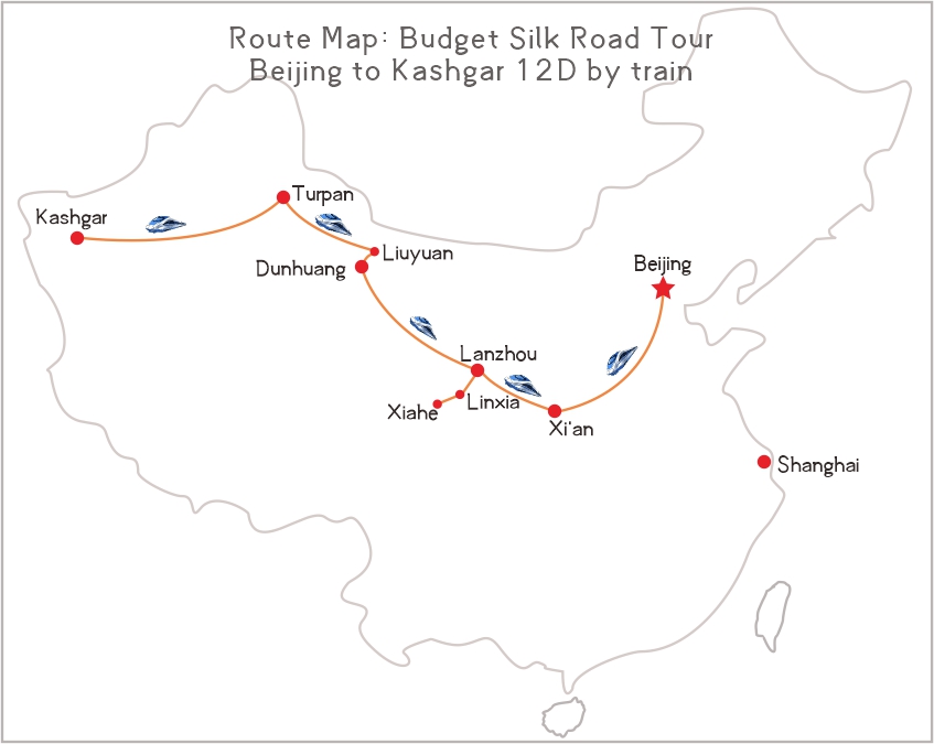 This budget tour starts from Beijing, and travel to Xian, Lanzhou, Dunhuang, Turpan and Kashgar for 12 days by train. You will view the must-see attractions on the ancient Silk Road in China.