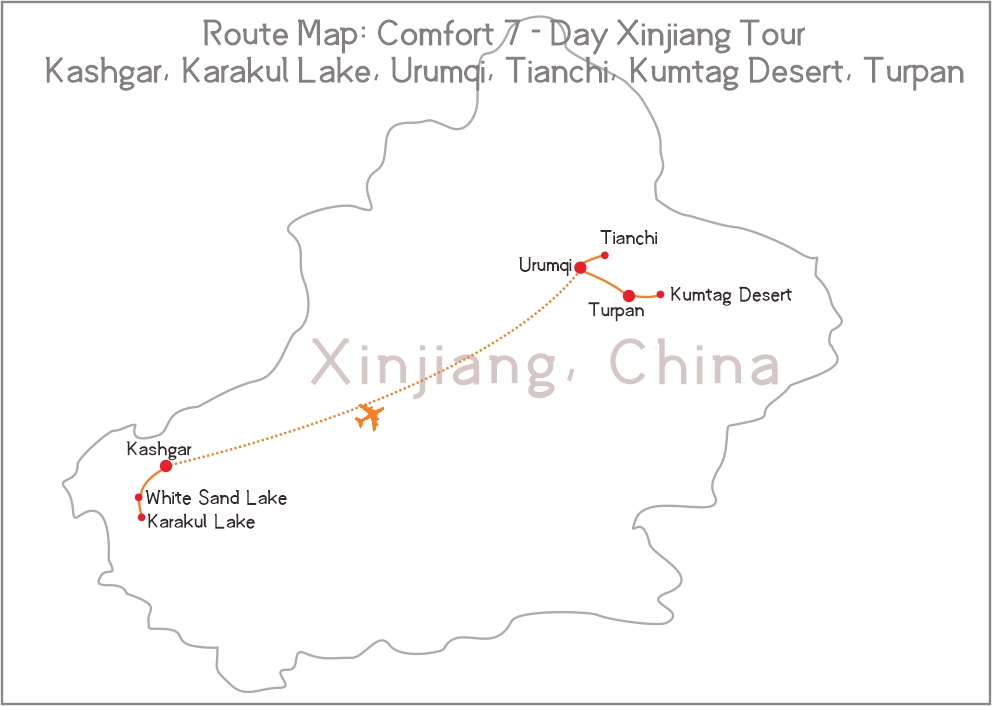 Xinjiang is an amazing province in China with its well-known and spectacular history as well as the fantastic landscapes attracting travelers to explore. This is a 7-day comfort tour to travel from Kashgar to Karakul Lake, Urumqi, Tianchi, Kumtag Desert and Turpan by flight and car in Xinjiang. You will enjoy the adventure on the impressive land with your local guide.