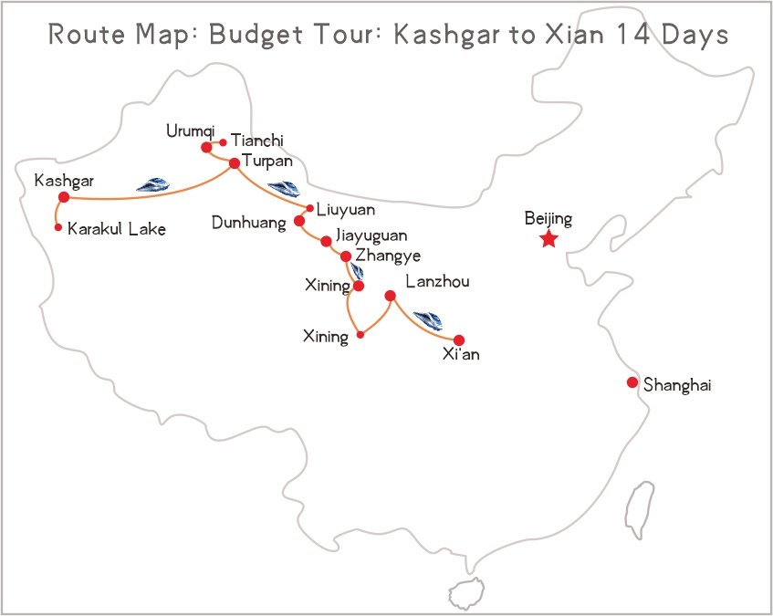 This 14-day Silk Road tour takes you to explore the ancient Silk Road from Kashgar to Xian on Budget by taking car, hard sleeper etc. You will travel to Kashgar, Turpan, Dunhuang, Jiayuguan, Zhangye, Kumbum & Labrang Monastery, Lanzhou, and Xian etc.